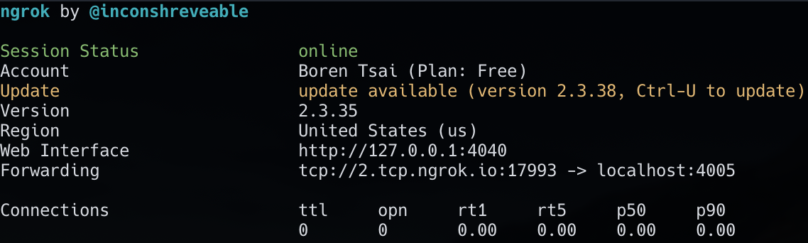 Now that you’ve added the ngrok executable to your path and are using the port 4005, open a new terminal and use the command ngrok tcp 4005.