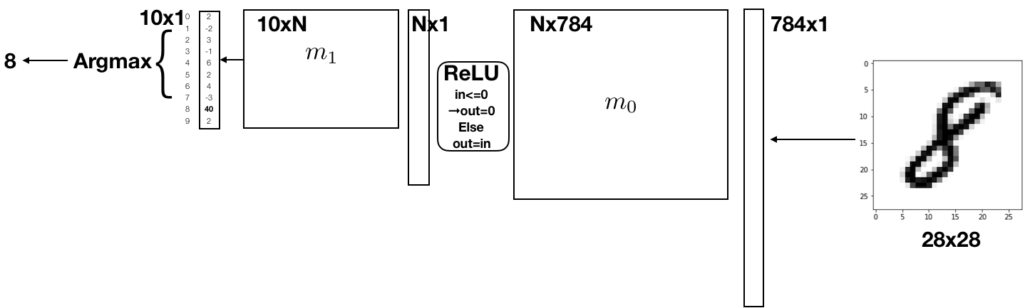 In this project we will implement a similar, but slightly more complex network which is able to classify handwritten digits. As inputs, we will use the MNIST data set, which is a dataset of 60,000 28x28 images containing handwritten digits ranging from 0-9. We will treat these images as “flattened” input vectors sized 784x1. In a similar way to the example before, we will perform matrix multiplications with pre-trained weight matrices m_0 and m_1. Instead of thresholding we will use two different non-linearities: The ReLU and ArgMax functions. Details will be provided below.