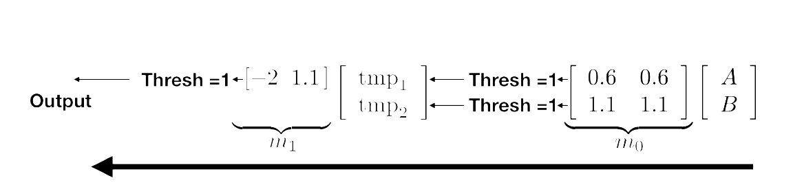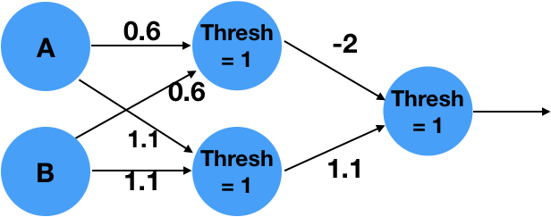 More complex functions can not be described by a simple neuron alone. We can extend the system into a network of neurons, in order to approximate the complex functions. For example, the following 2 layer network approximates the logical function XOR: