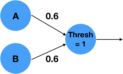 It is easy to see that for \(A=0\), \(B=0\), the linear combination \(0*0.6 + 0*0.6 = 0\), which is less than the threshold of 1 and will result in a 0 output. With an input \(A=0\), \(B=1\) or \(A=1\), \(B=0\) the linear combination will results in \(1*0.6 + 0*0.6 = 0.6\), which is less than 1 and result in a 0 output. Similarly, \(A=1\), \(B=1\) will result in \(1*0.6+1*0.6=1.2\), which is greater than the threshold and will result in a 1 output! What is interesting is that the simple neuron operation can also be described as an inner product between the vector \([A,B]^T\) and the weights vector \([0.6,0.6]^T\) followed by as thresholding, non-linear operation.