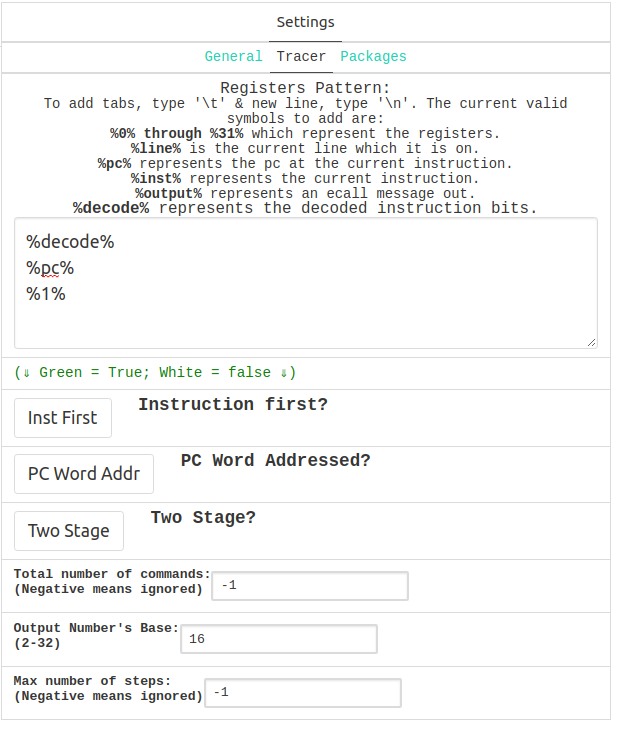 For example, the following settings will enable you to print the instruction itself as well as the registers pc and x1 in hexadecimal (base 16) on every step of your program: